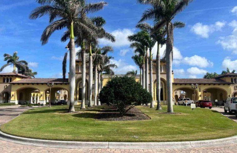 Lush landscaping with dozens of royal palms flank the ornate Spanish Mediterranean entrance to Gran Paradiso, a community of more than a thousand homes within Wellen Park in south Sarasota County. The West Villages Improvement District that governs Wellen Park cut off irrigation water to Gran Paradiso on March 31 amid a bitter legal dispute. | Photo by Emily Le Coz, Suncoast Searchlight